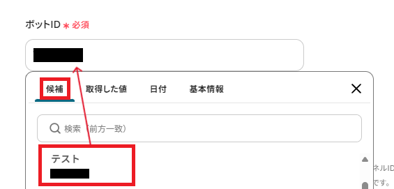 「ボットID」は、入力欄をクリックして表示される候補から選択してください。