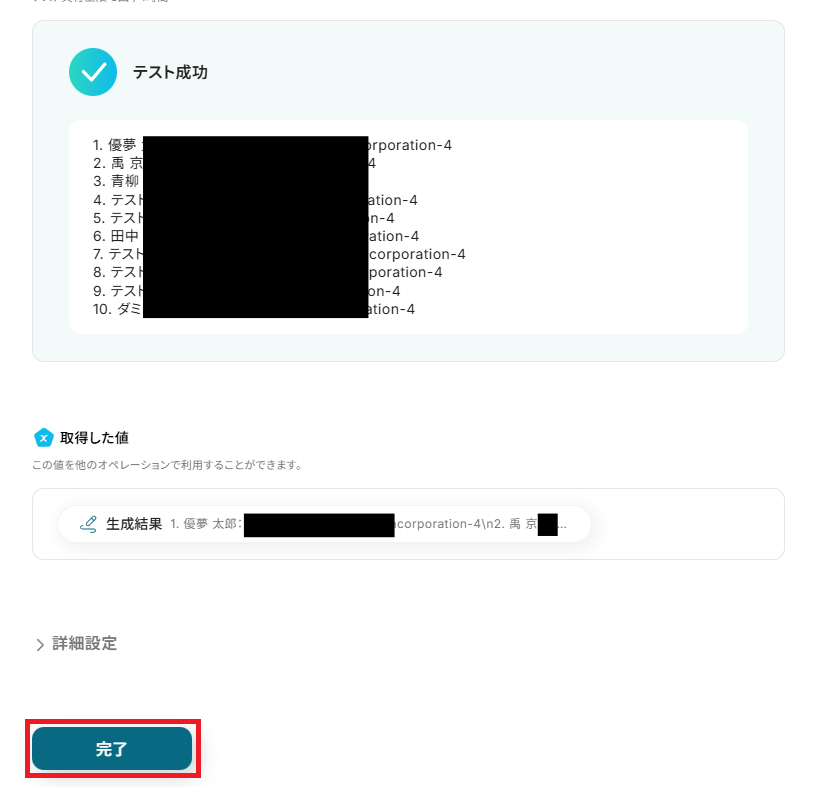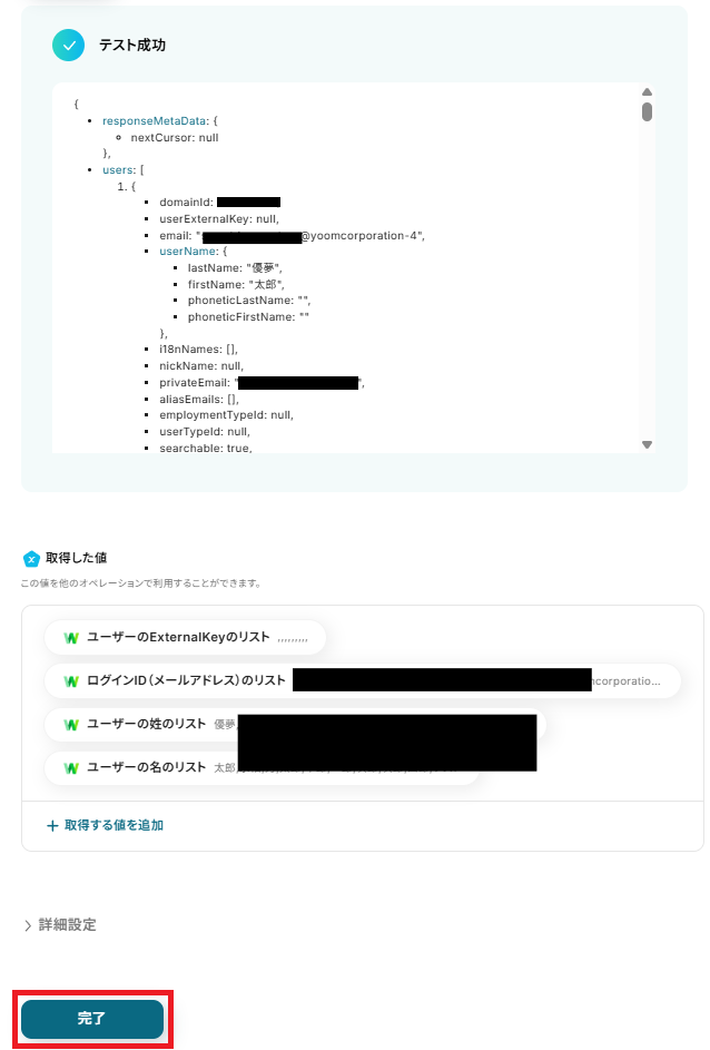 確認できたら、Yoomに戻り「完了」を押してください。