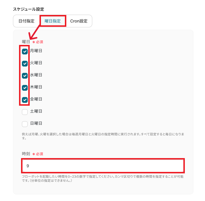 曜日指定以外にも、日付指定やCron設定を使用して自由に設定することができます。