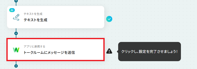 ・LINE WORKSの「トークルームにメッセージを送信」というオペレーションで、連携アカウントや送信先のルーム、メッセージ内容の設定を行ってください。