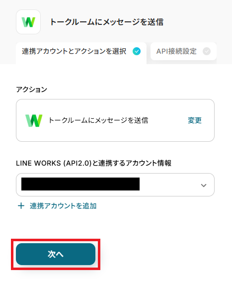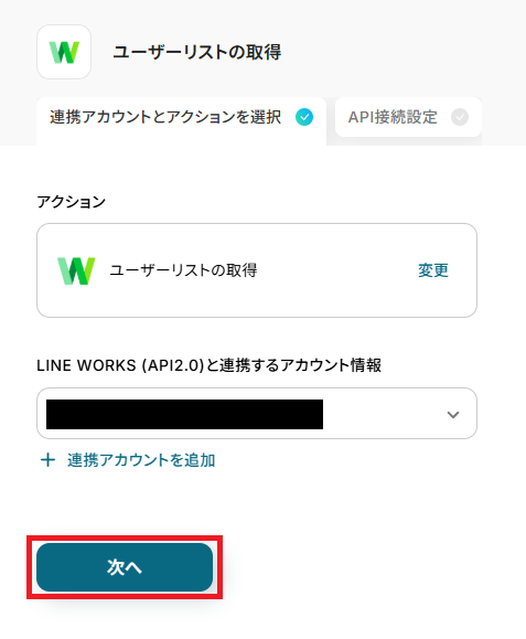 再度、LINE WORKSと連携するアカウントに間違いがないかを確認し、「次へ」をクリックしましょう。