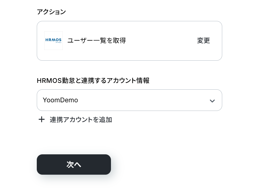 HRMOS勤怠と連携するアカウント情報に誤りがないかを確認し、アクションは「ユーザー一覧を取得」のままで「次へ」をクリックします。