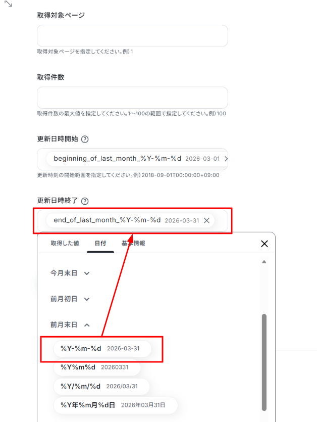 会社に所属するユーザー一覧を取得します。 下の画像では「日付」を使って対象を指定しています。 「日付」を使って入力することで、都度変更することなく自動的に日付を変換することができます。 入力が終わったら「テスト」をクリックしましょう!