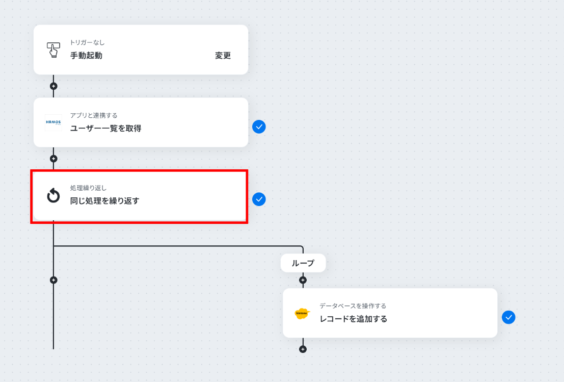 ステップ5:同じ処理を繰り返す 続いて、ステップ4で取得したリスト形式の情報をユーザーごとに切り分ける設定を行います。 これにより、ユーザーごとの詳細情報を個別にkintoneに追加できるようになります! 「同じ処理を繰り返す」をクリックしましょう。 ※「同じ処理を繰り返す」オペレーション間の操作は、チームプラン・サクセスプランでのみご利用いただける機能となっております。 フリープラン・ミニプランの場合は設定しているフローボットのオペレーションやデータコネクトはエラーとなりますので、ご注意ください。