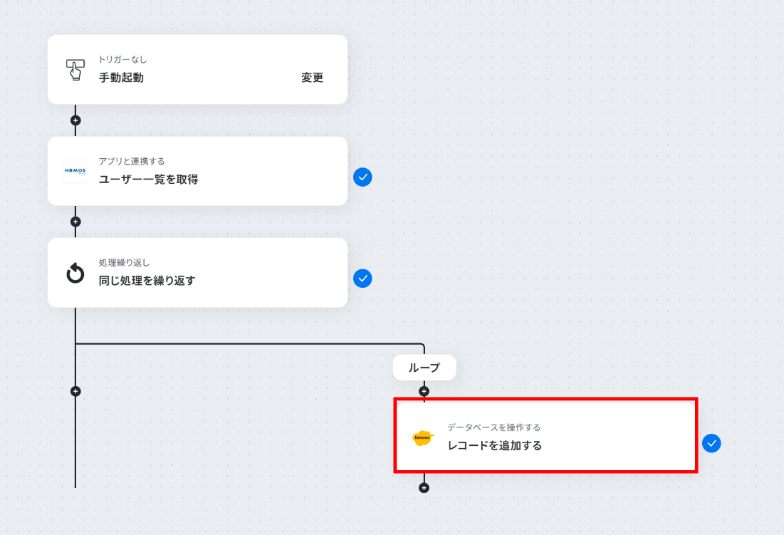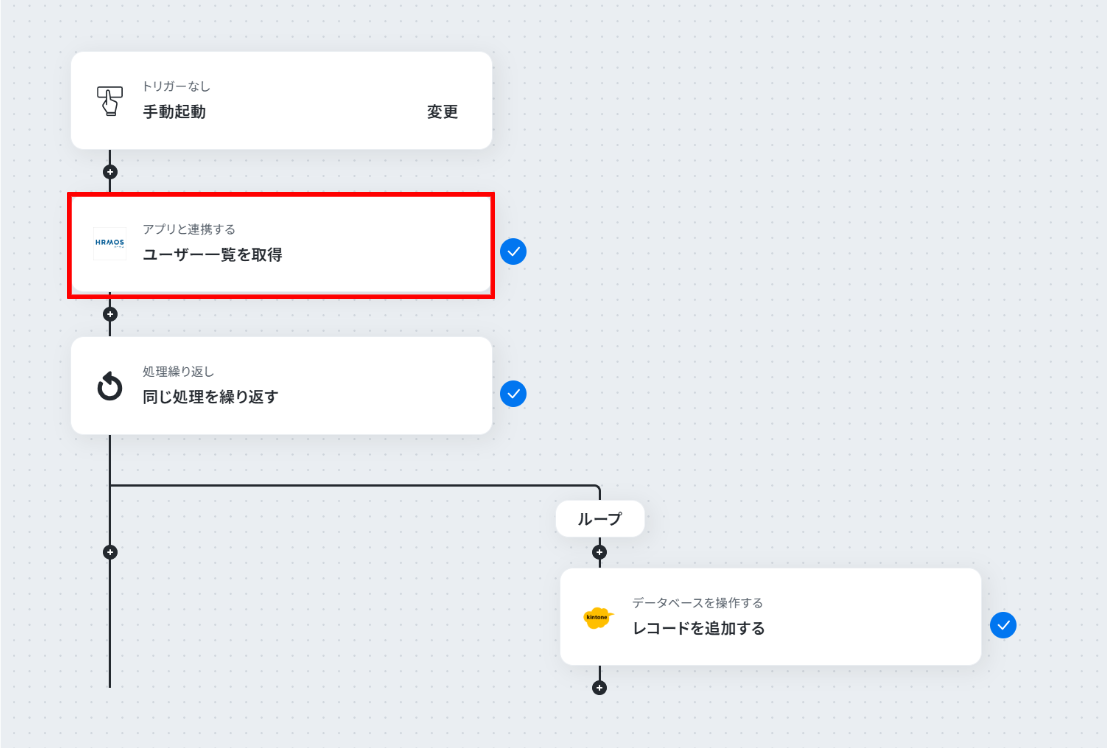 HRMOS勤怠からユーザー一覧を取得してkintoneに記録するフローを作ってみよう それではここから代表的な例として、定期的にHRMOS勤怠からユーザー一覧を取得し、kintoneのアプリに自動で記録する フローを解説していきます!