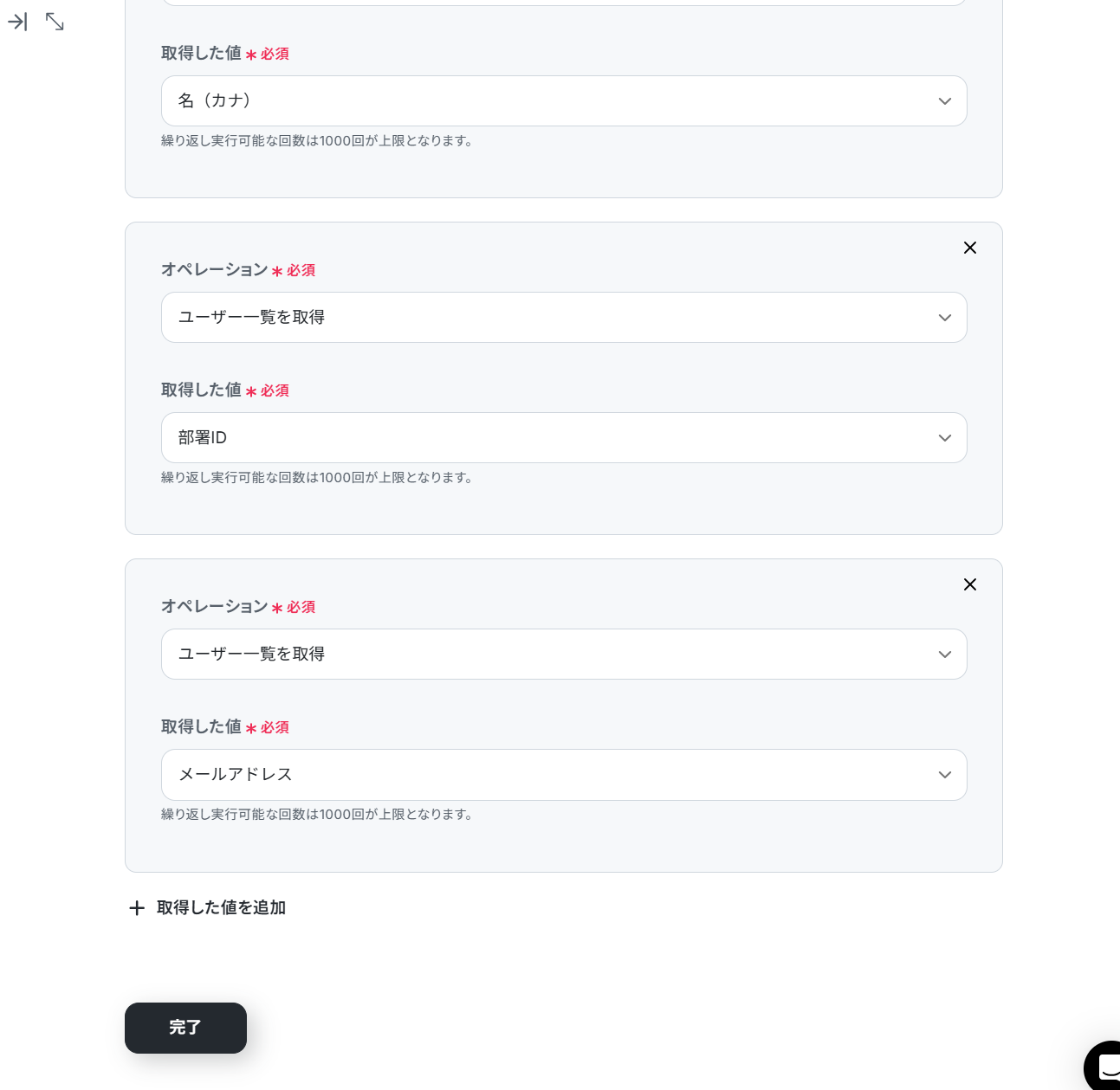 オペレーション:「ユーザー一覧を取得」を選択 取得した値:取得したい情報を選択 項目の追加は「+取得したい値を追加」をクリックすることで追加することができます! 詳しい設定方法は下記のページをご参照ください。