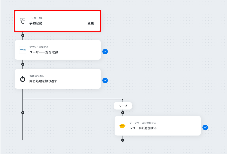 はじめに、HRMOS勤怠とkintoneをYoomと連携します。 次に、トリガーで「手動でフローボットを起動」を設定します。 オペレーションで、HRMOS勤怠の「ユーザー一覧を取得する」アクションを設定します。 次に、「繰り返し機能」を設定し、取得したユーザー一覧のデータをもとに後続の処理を行うようにします。 最後に繰り返しの処理の中で、kintoneの「レコードを追加する」アクションを設定し、取得したユーザー情報を指定のアプリに記録します。 ※「トリガー」:フロー起動のきっかけとなるアクション、「オペレーション」:トリガー起動後、フロー内で処理を行うアクション■このワークフローのカスタムポイント