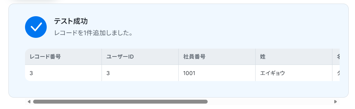 テストに成功すると、指定したkintoneのレコードに情報が追加されます! Yoomに戻って「完了」をクリックしましょう。【補足】 フローボット設定のテストでは、ユーザー1名に関するレコードしか追加されていませんが、実際にフローボットを起動した際にはステップ5の「同じ処理を繰り返す」で取得したすべてのユーザーに関する情報が反映されます!