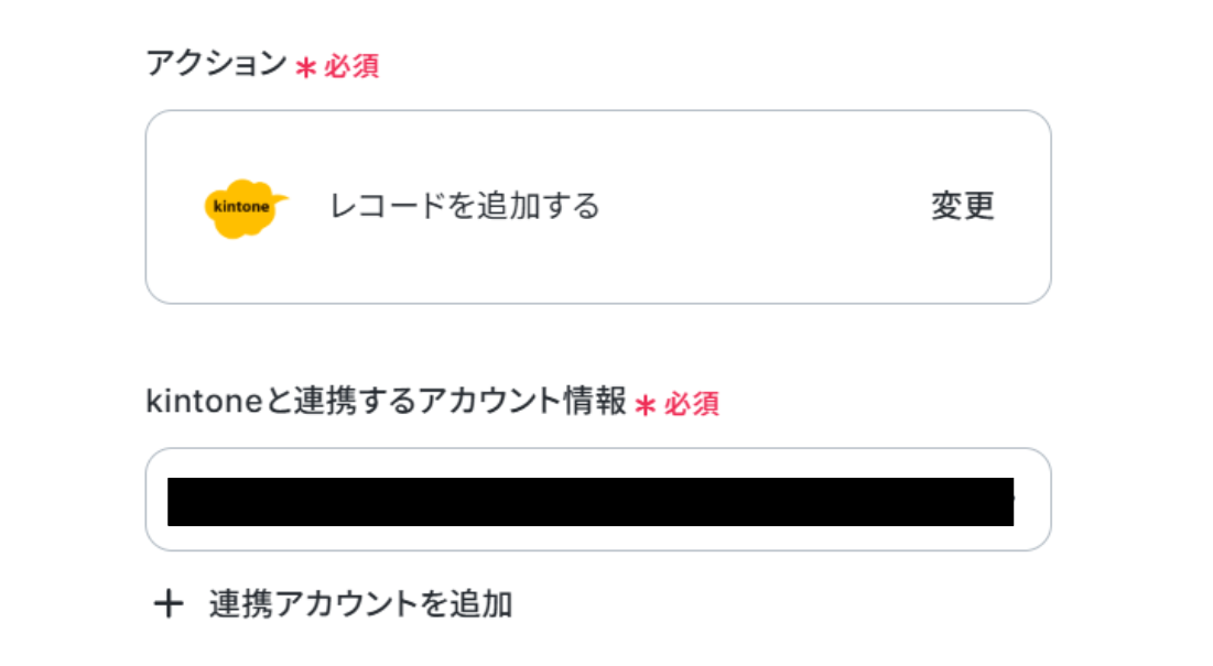 kintoneと連携するアカウント情報に誤りがないかを確認し、アクションは「レコードを追加する」のままで下へ進みます。