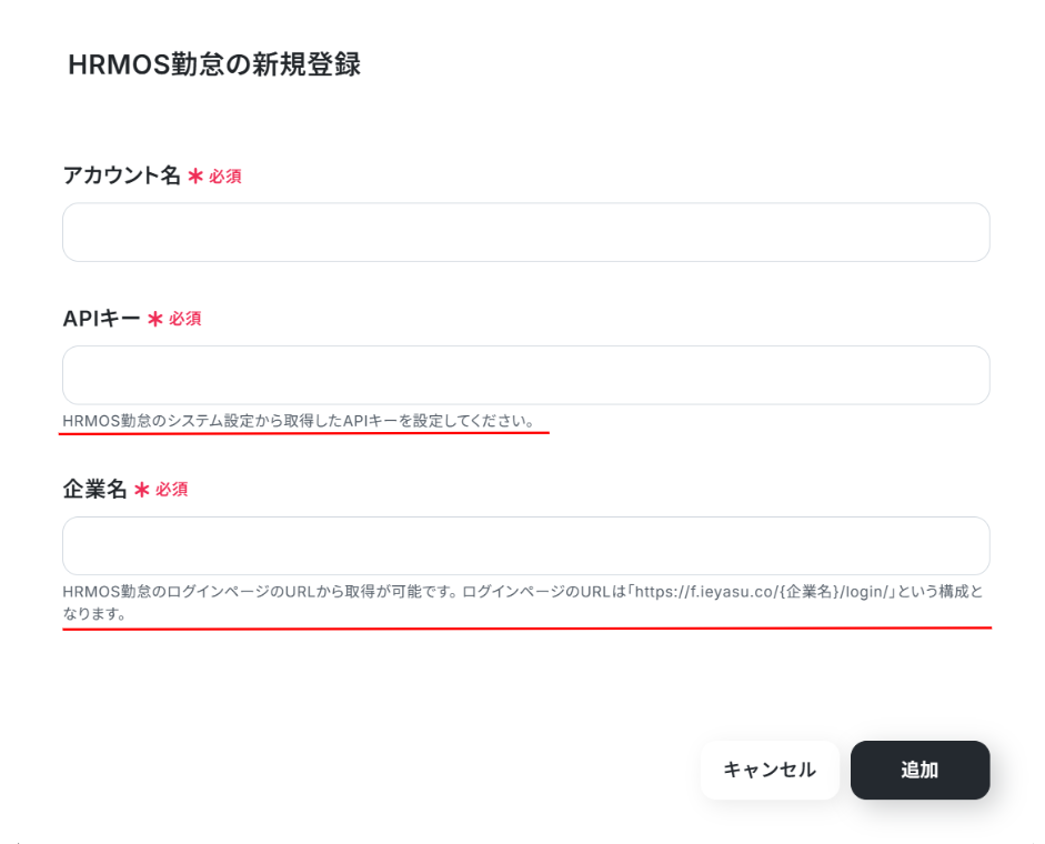 アカウント名:担当者など任意の名称を入力 APIキー:赤線を確認の上、HRMOS勤怠にログインし、「API KEYの生成」をクリックして作成したSecret Keyをコピーして入力 企業名:赤線を確認の上、HRMOS勤怠にログインし、ログインページのURLを確認して入力 入力が終わったら「追加」をクリックしましょう!
