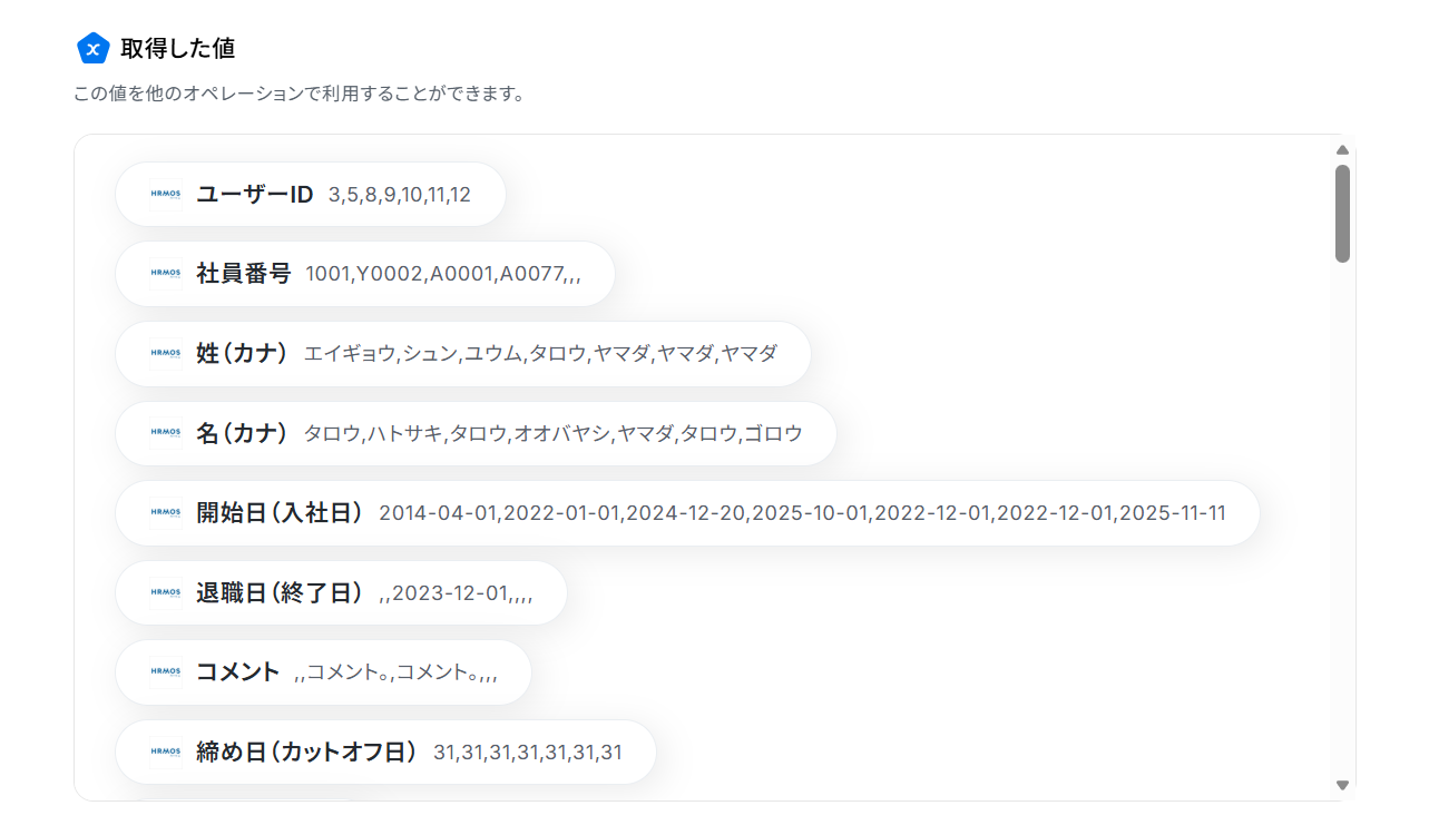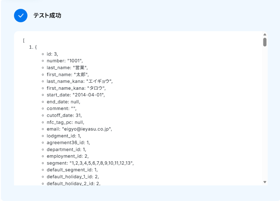 テストに成功すると、「取得した値」にHRMOS勤怠の情報が反映されます。