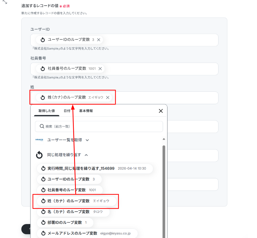 追加したい項目に、先ほど取得した「ループ変数」を使って入力します。