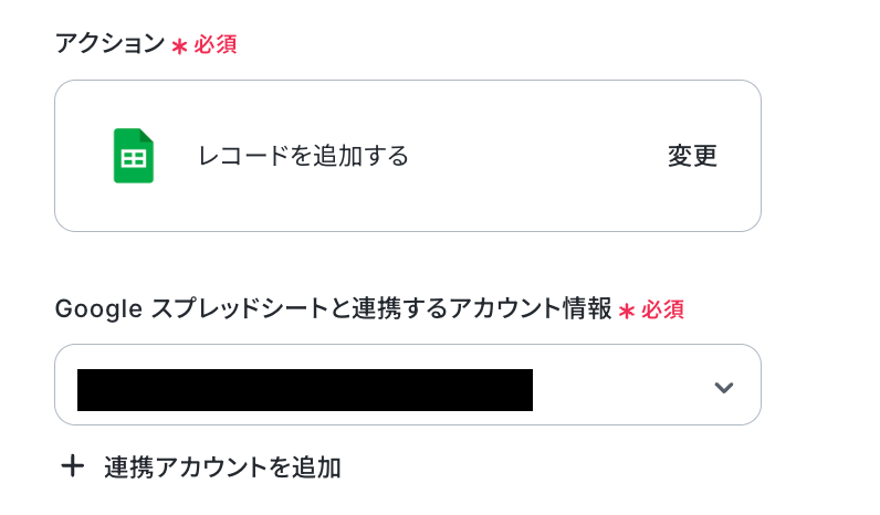 - 最後に、オペレーションでGoogle スプレッドシートの「レコードを追加する」アクションを設定し、送付依頼の情報を指定のシートに行として追加します。