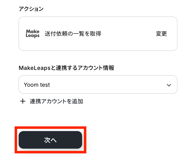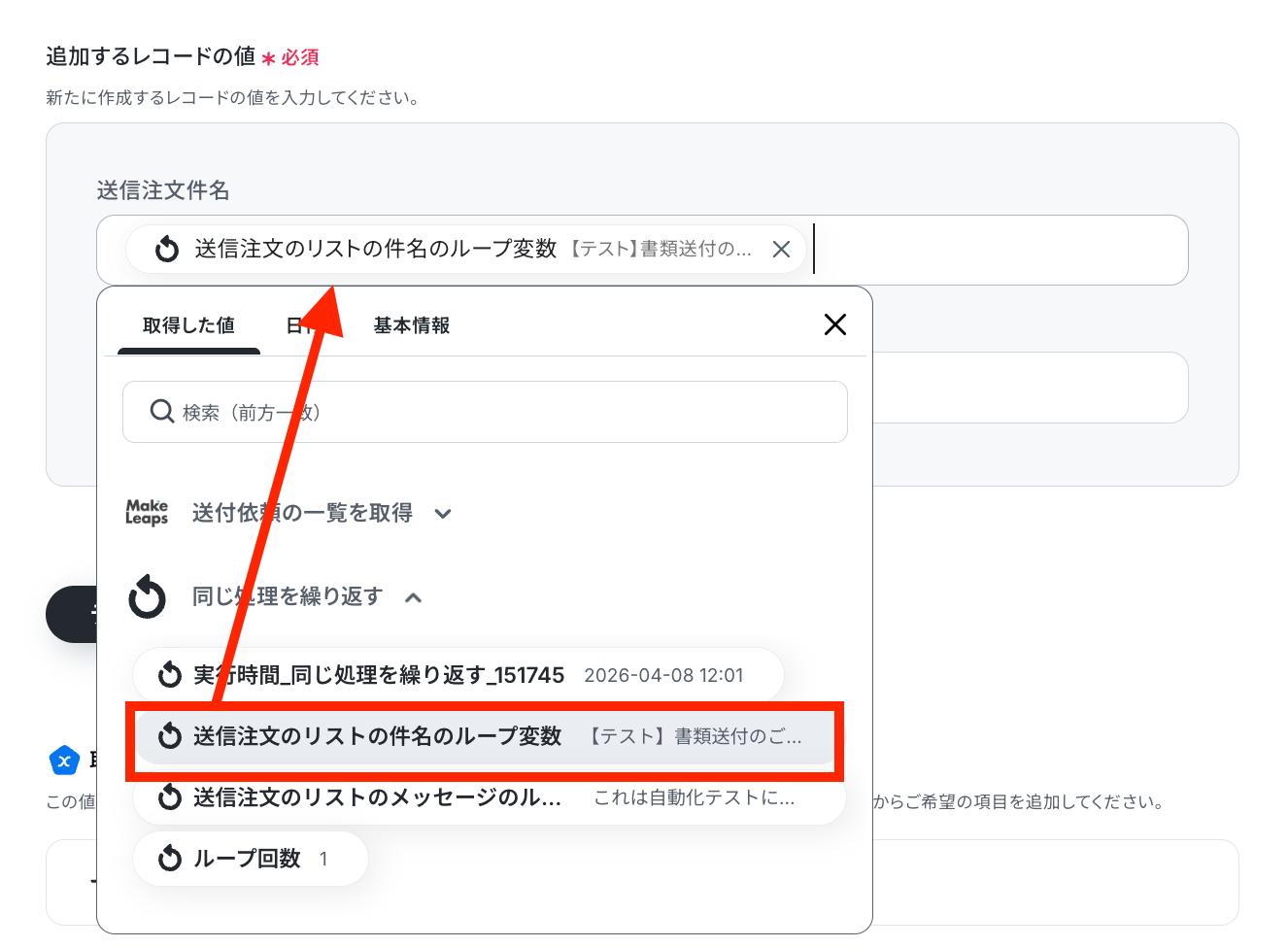 - 次に、オペレーションでMakeLeapsの「送付依頼の一覧を取得する」アクションを設定します。