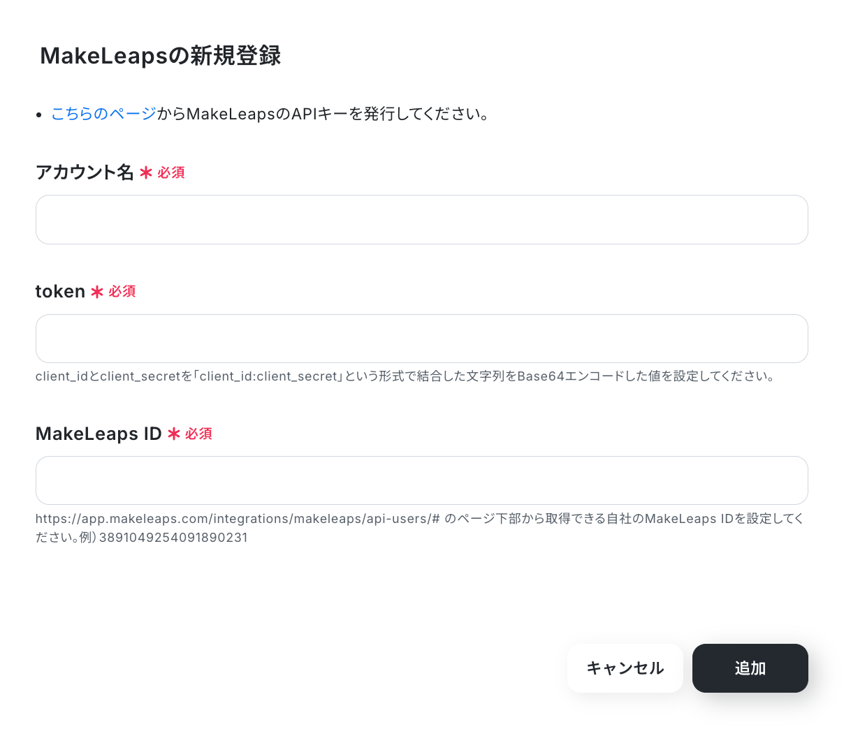 任意のアカウント名を設定し、取得したtokenとMakeLeaps IDを設定したら「追加」ボタンをクリックします。