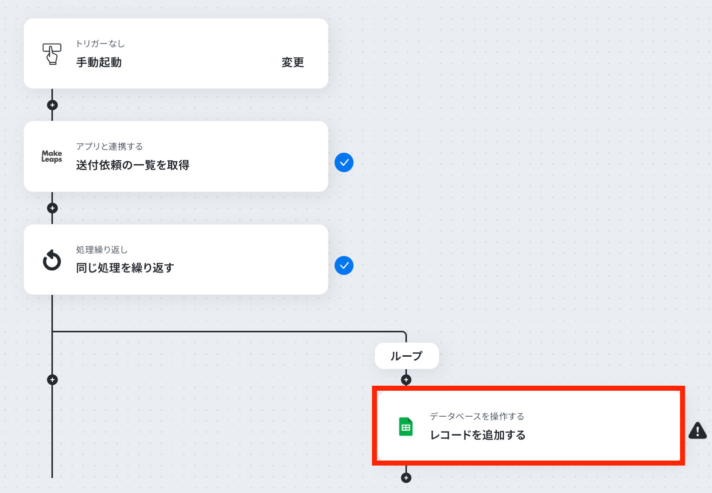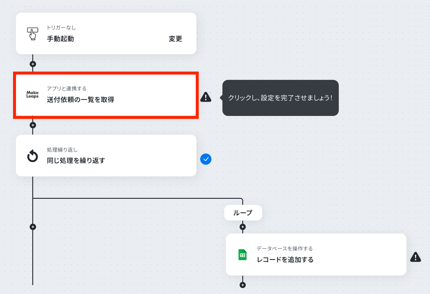 それではここから代表的な例として、定期的にMakeLeapsの送付依頼一覧を取得し、Google スプレッドシートに自動で追加するフローを解説していきます!