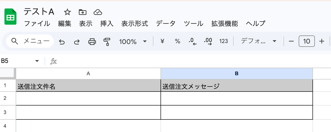 Google スプレッドシートに新しいレコードを追加するためのシートを作成しておきます。