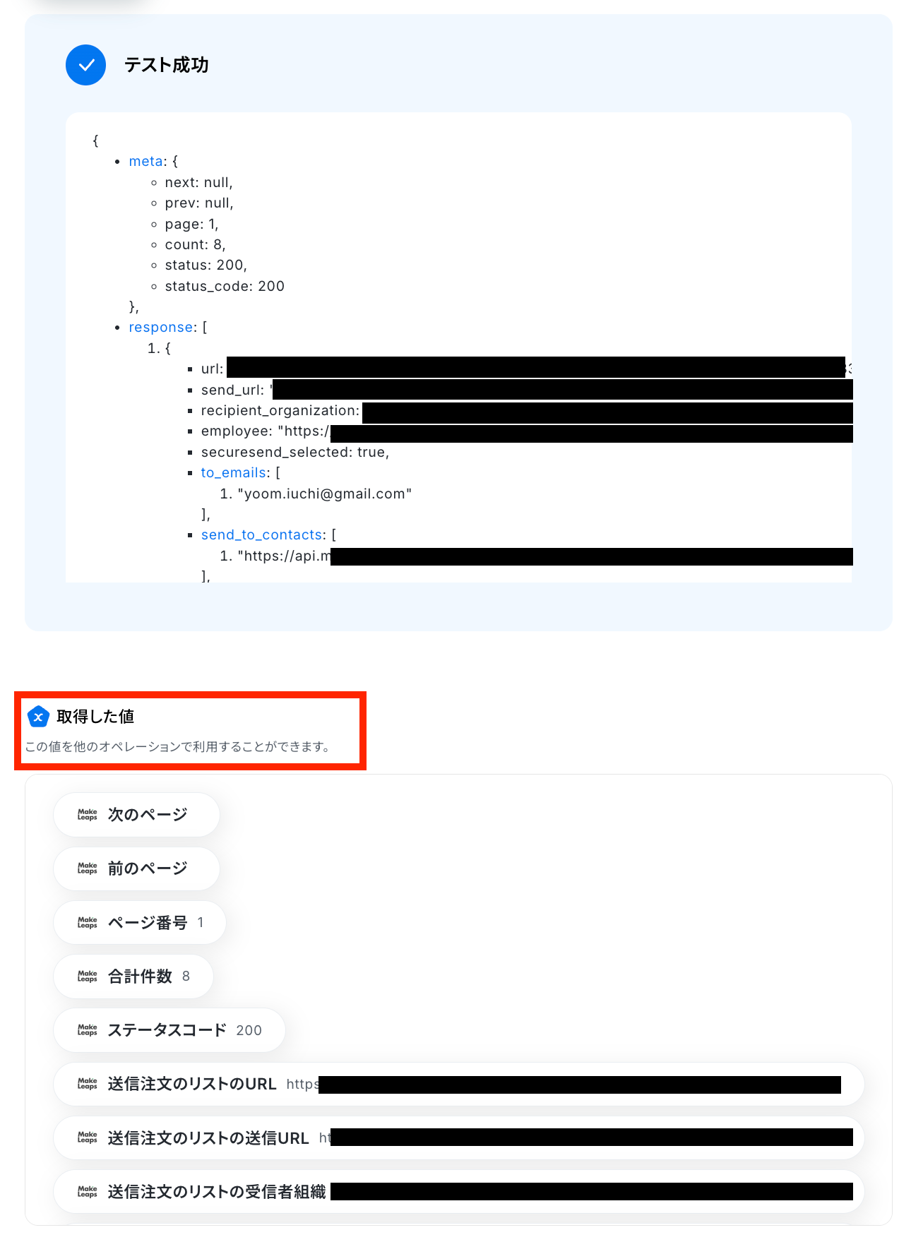 テスト成功で、取得した値が取得されます。
