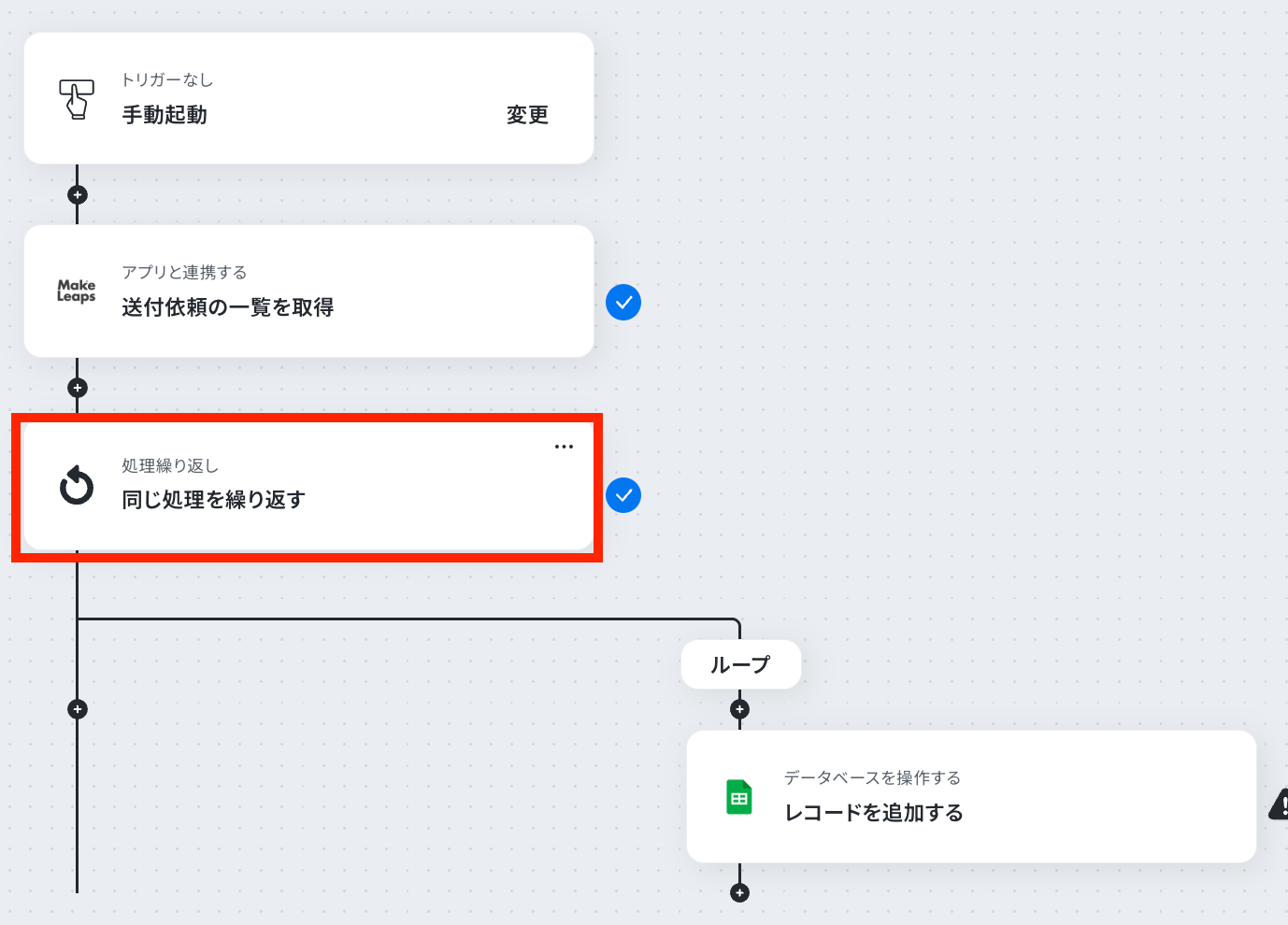 ※「同じ処理を繰り返す」オペレーション間の操作は、チームプラン・サクセスプランでのみご利用いただける機能となっております。
