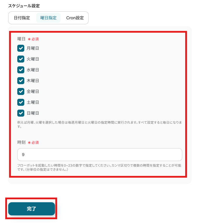 今回は「曜日設定」で毎朝9時にフローボットを起動する設定にしました。