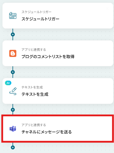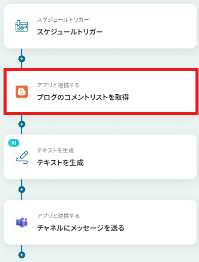 このワークフローを活用すれば、毎日決まった時間にBloggerからコメントを自動で取得し、AIが要約した内容をMicrosoft Teamsへ通知可能です。