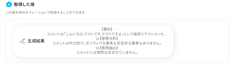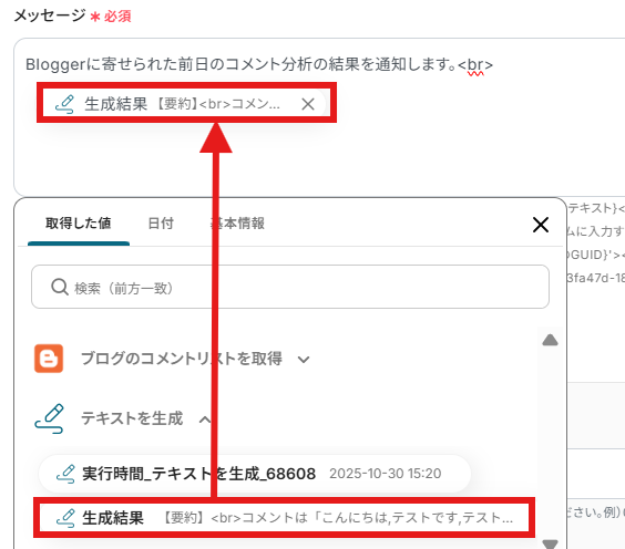 通知するメッセージの内容を入力していきます。取得した値より生成結果を選択し、他の部分は例に倣ってわかりやすく入力しましょう。