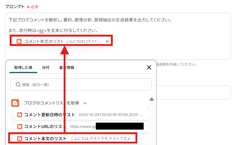 プロンプトはAIへの指示を記載していきます。取得した値が使えるので、わかりやすく記載しましょう。