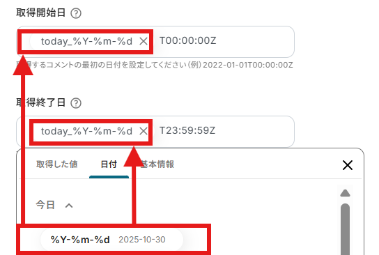 取得開始日、取得終了日を注釈に沿った形で入力します。「日付」から注釈通りの形式の日付を選び、時間は「T00:00:00Z・T23:59:59Z」とそれぞれ入力します。