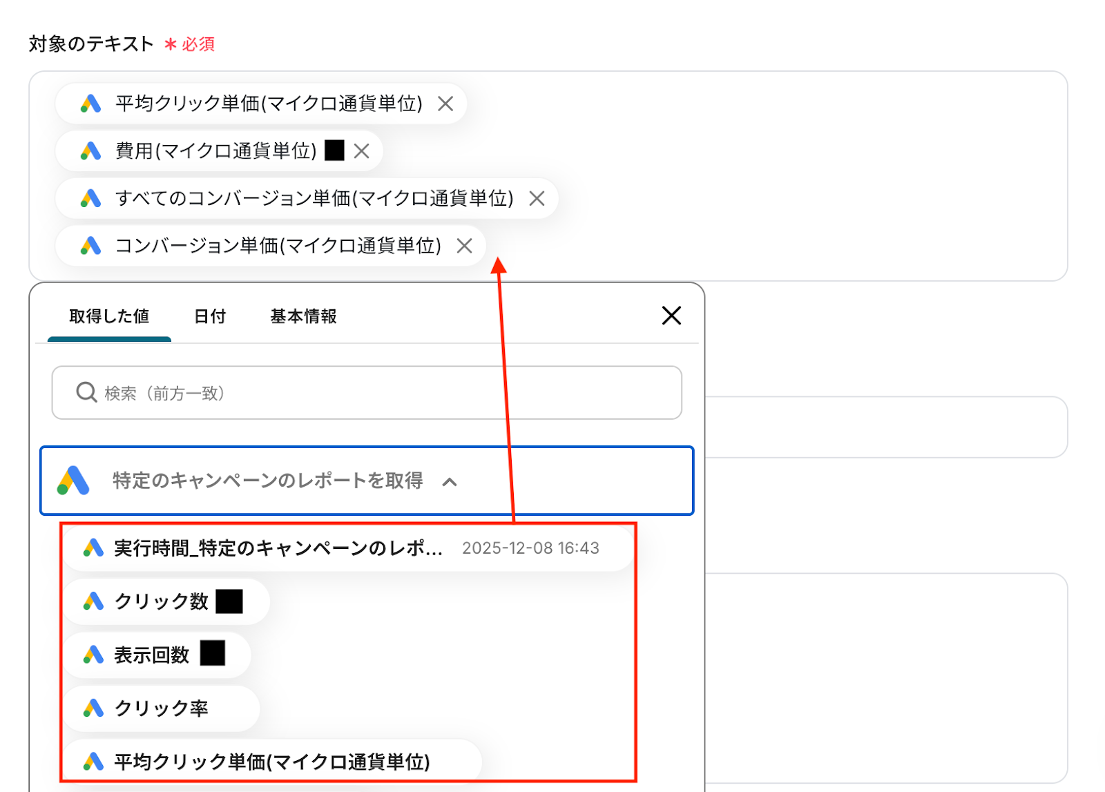 入力欄をクリックすると、前のステップでGoogle Adsから取得した値が表示されるので、選択して入力しましょう。