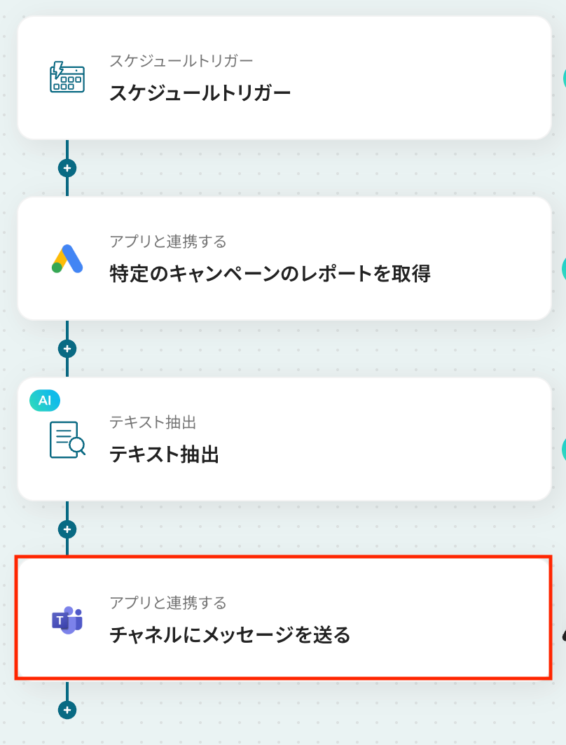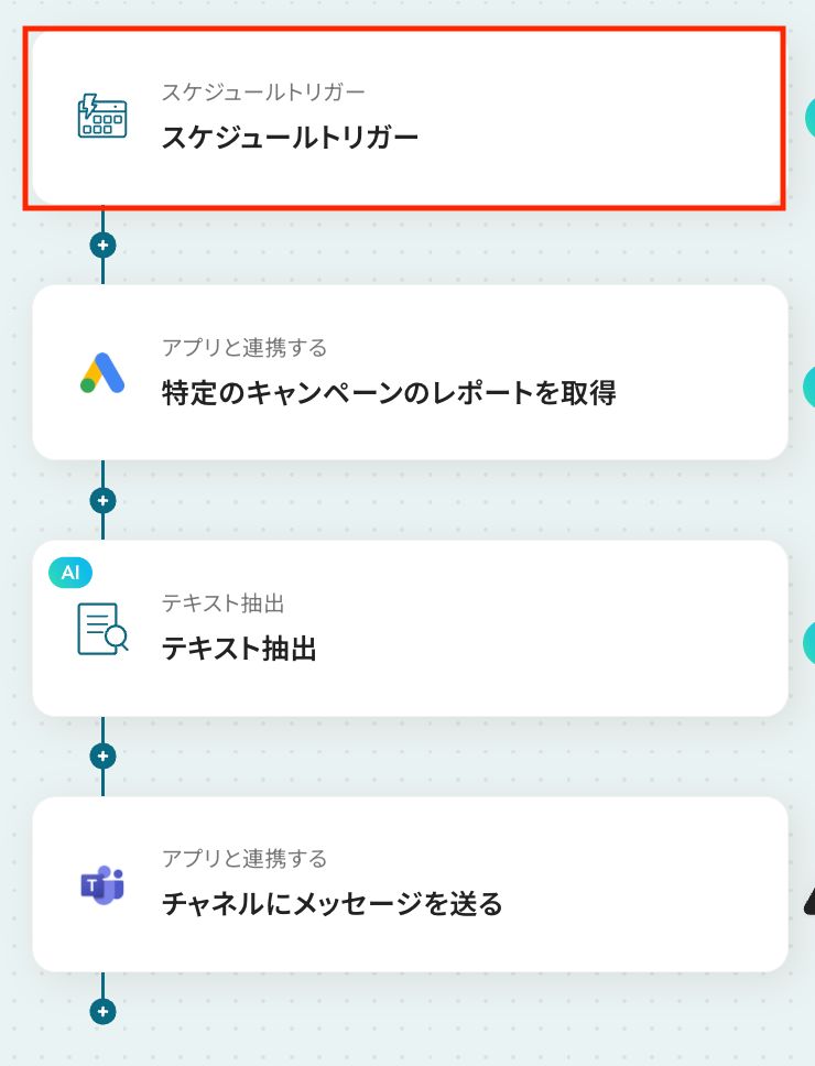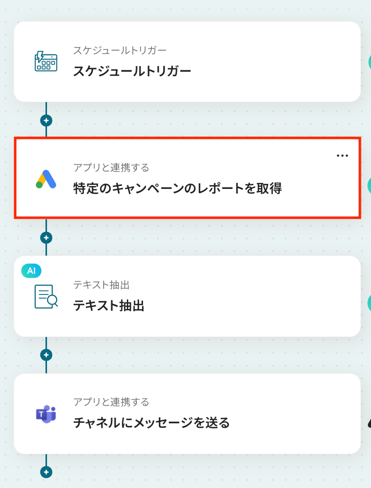 スケジュールトリガー機能では、レポートを取得したい曜日や時間など、フローを起動する日時を任意で設定してください。 Google Adsでレポートを取得するアクションでは、対象の広告アカウントIDやキャンペーン名、レポートの集計期間を任意で設定できます。 AI機能によるテキスト抽出では、Google Adsから取得したレポート情報を変数として利用し、抽出したい項目やその形式を任意で指定することが可能です。 Microsoft Teamsへの通知設定では、通知先のチャネルを任意で設定できるほか、本文に固定のテキストや前段のオペレーションで取得した情報を変数として埋め込めます。 ■注意事項
