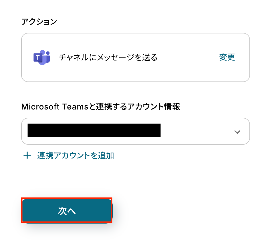 アクションはあらかじめ設定されているため、そのまま内容を確認してください。 Microsoft Teamsと連携するアカウント情報に問題がなければ、「次へ」をクリックします。