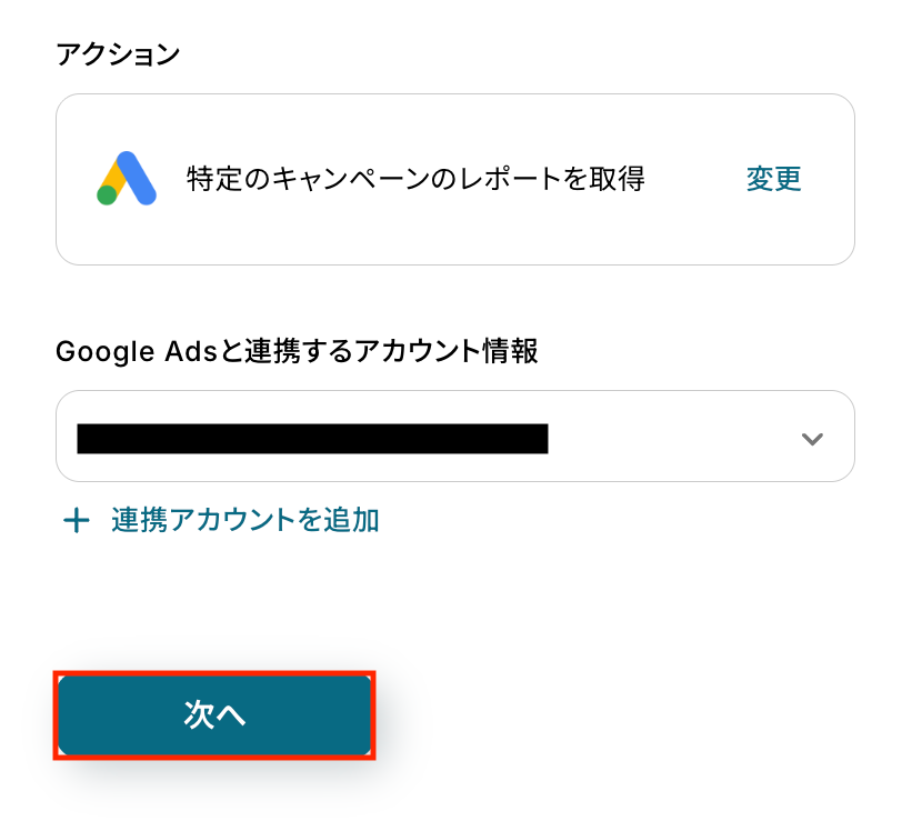 アクションはあらかじめ設定されているため、そのまま内容を確認してください。 Google Adsと連携するアカウント情報に問題がなければ、「次へ」をクリックします。