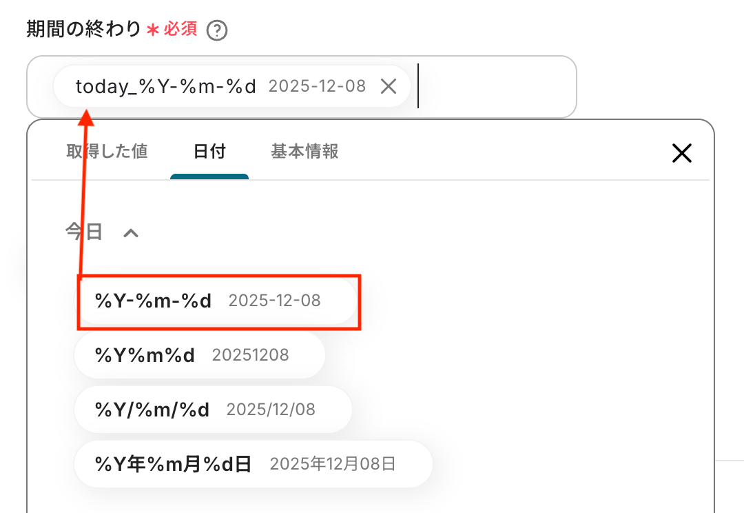 入力欄をクリックすると、前のステップでテキスト抽出した値が表示されるので、選択して入力しましょう。 取得した値を活用することで値が固定化されず、フローボットを起動するたびに最新の情報を自動で反映できます。