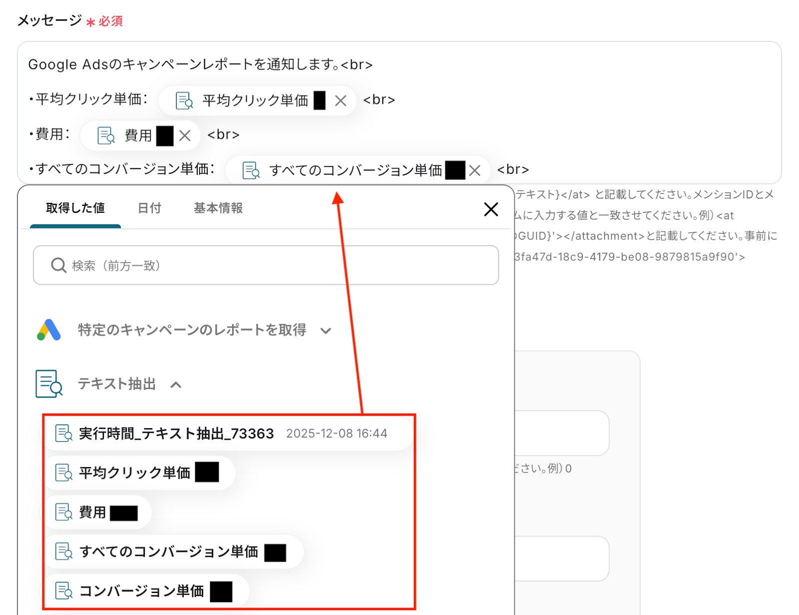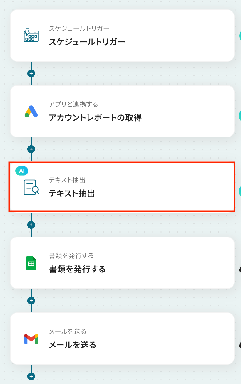 ステップ5:AI機能でテキスト抽出 続いて、前のステップでGoogle Adsから取得した値を利用して、AI機能で必要な情報を抽出する設定を行いましょう。