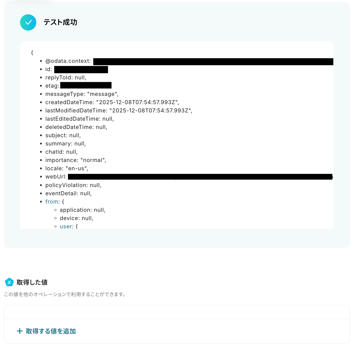 なお、テキストを直接入力した部分は固定値とされるため、取得した値を活用せず設定を行うと毎回同じメッセージがMicrosoft Teamsで通知されてしまうので注意が必要です。
