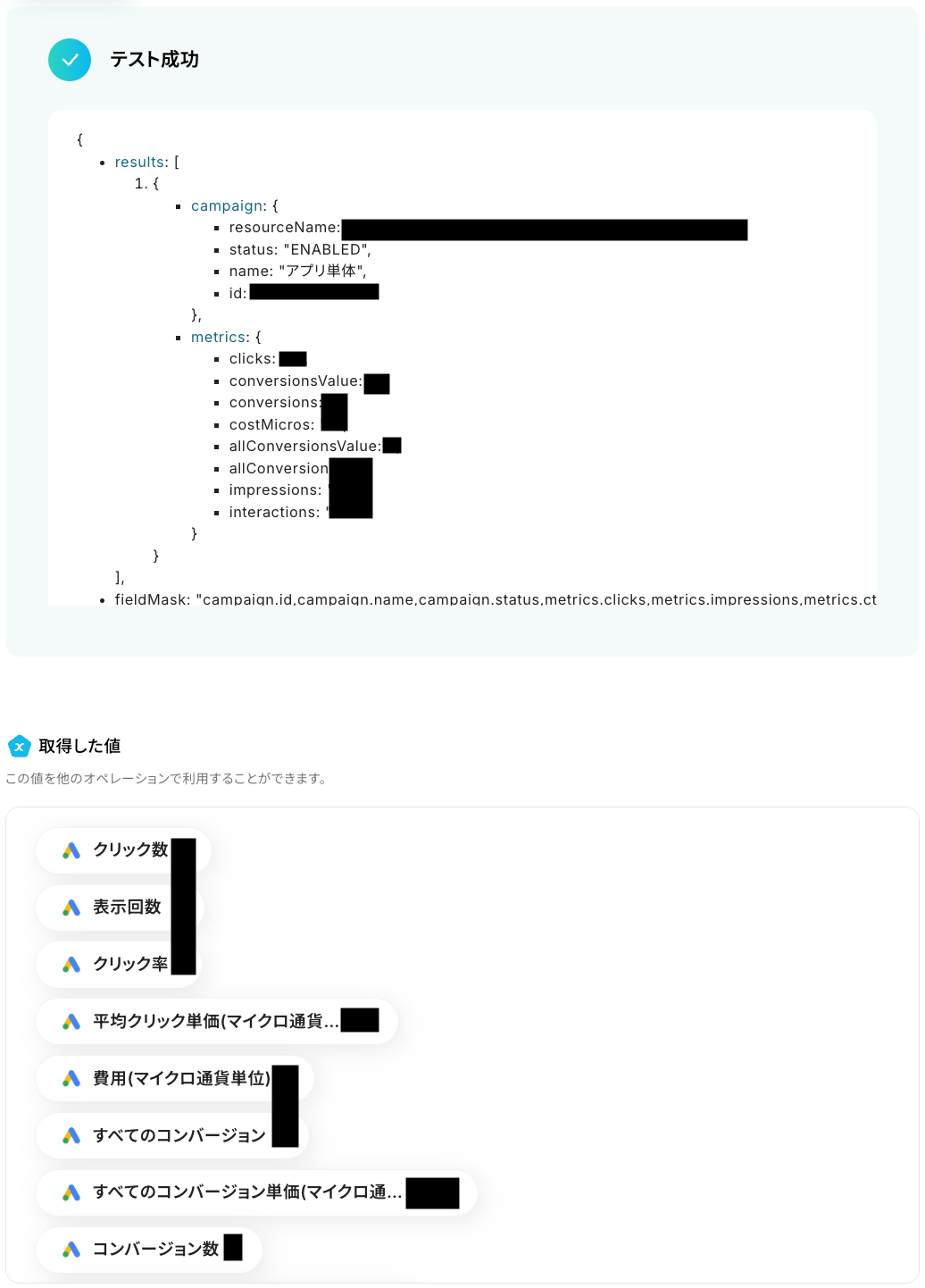 テストに成功すると、Google Adsから取得された特定のキャンペーンのレポート情報が表示されます。 以下の画像の取得した値はこの後のステップで利用することが可能です。