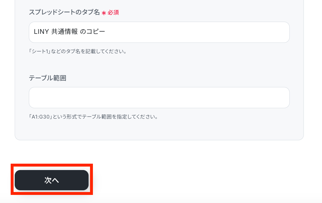 続いて、スプレッドシート内のタブ名も選択して、テーブル範囲を任意で設定したら、次の設定へ進みます。