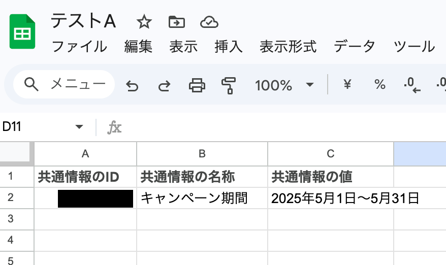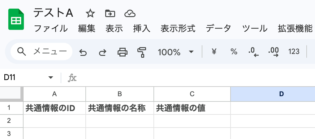 今回は、共通情報のIDと名称、値をスプレッドシートに追加していくので、3つの項目を用意しています! 詳しくは、下記をご参照ください。