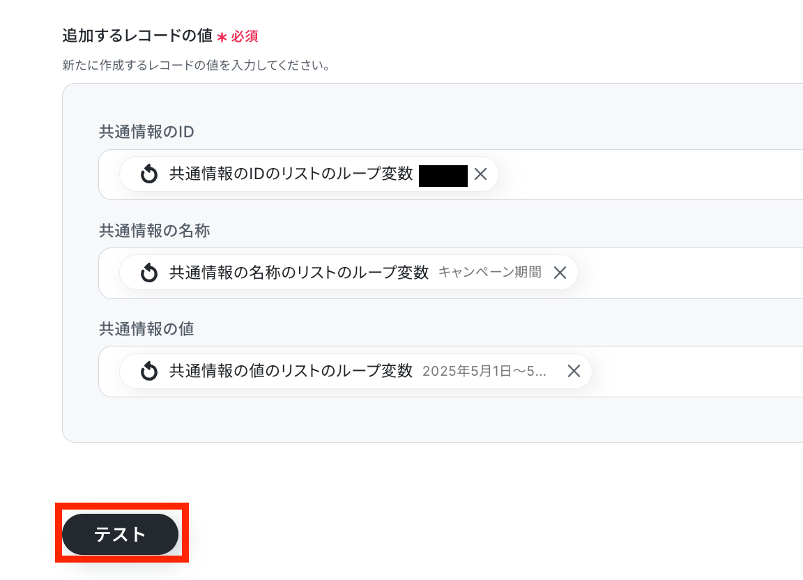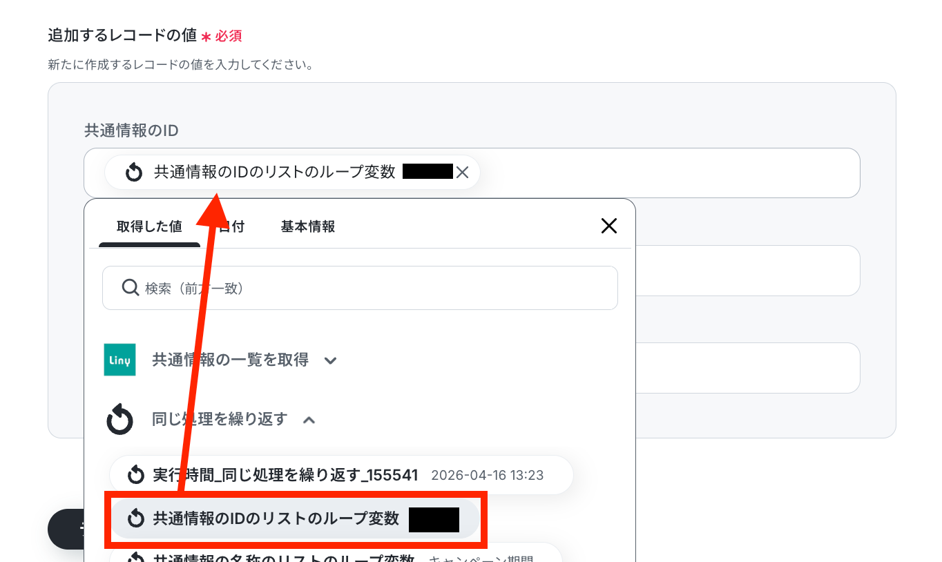 追加したいレコードの値を設定します!共通情報のIDは、取得した繰り返しのループ変数をセットしましょう。