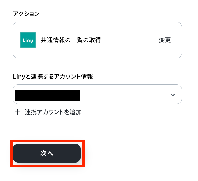アクションは、テンプレート通りに「共通情報の一覧の取得」のままで大丈夫です。 アカウントがしっかりと連携されているかを確認したら、「次へ」をクリックして進んでください。