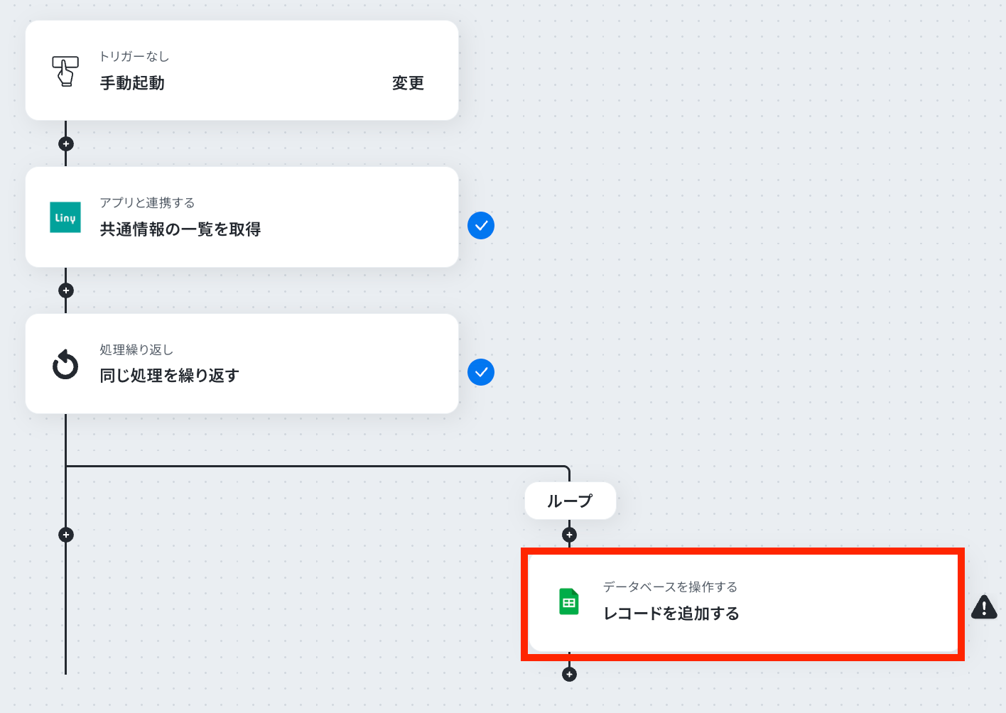 LINYで共通情報の一覧を取得する際に、対象としたいフォルダのIDを任意で設定してください。 Google スプレッドシートにレコードを追加するアクションでは、追加先のファイル(スプレッドシートID)やシートを任意で設定してください。 ループ機能では、前段のアクションで取得した情報の中から、繰り返し処理を行いたい情報を任意で設定することが可能です。 ■注意事項