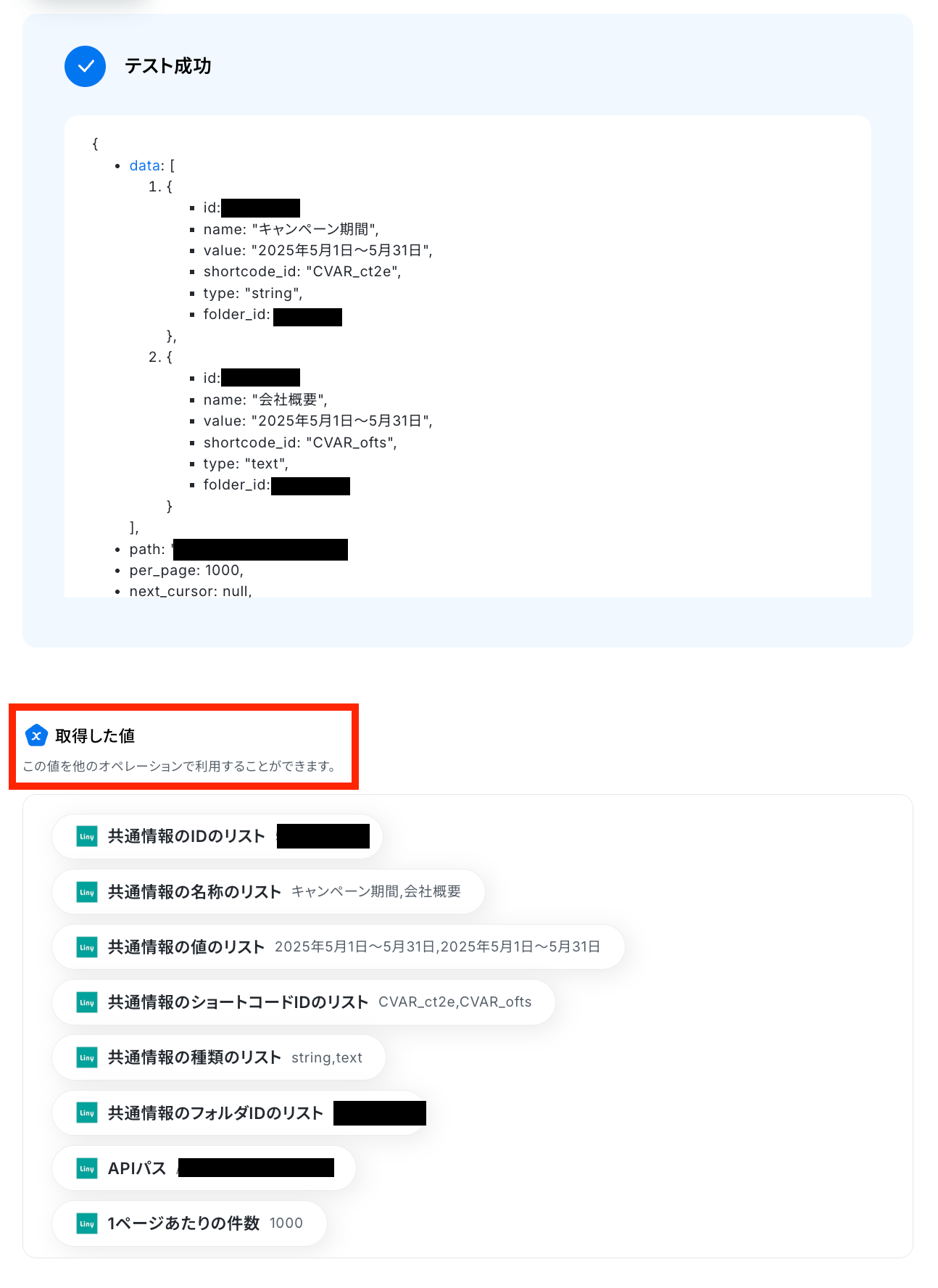 テスト成功で、取得した値 が取得されます。