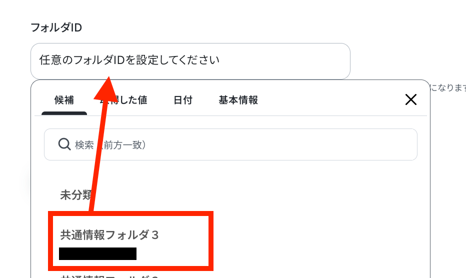 共通情報の一覧を取得したいフォルダを候補の中から選択します。