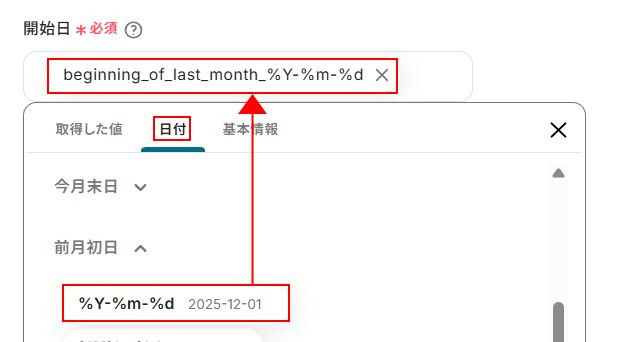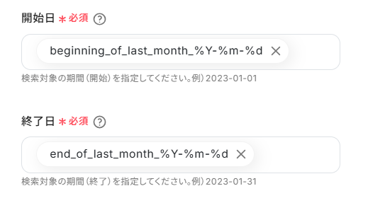 - スマレジ・タイムカードの「勤怠実績の一覧を取得」アクションでは、取得対象となる期間などを自由に設定できます。