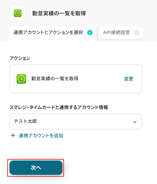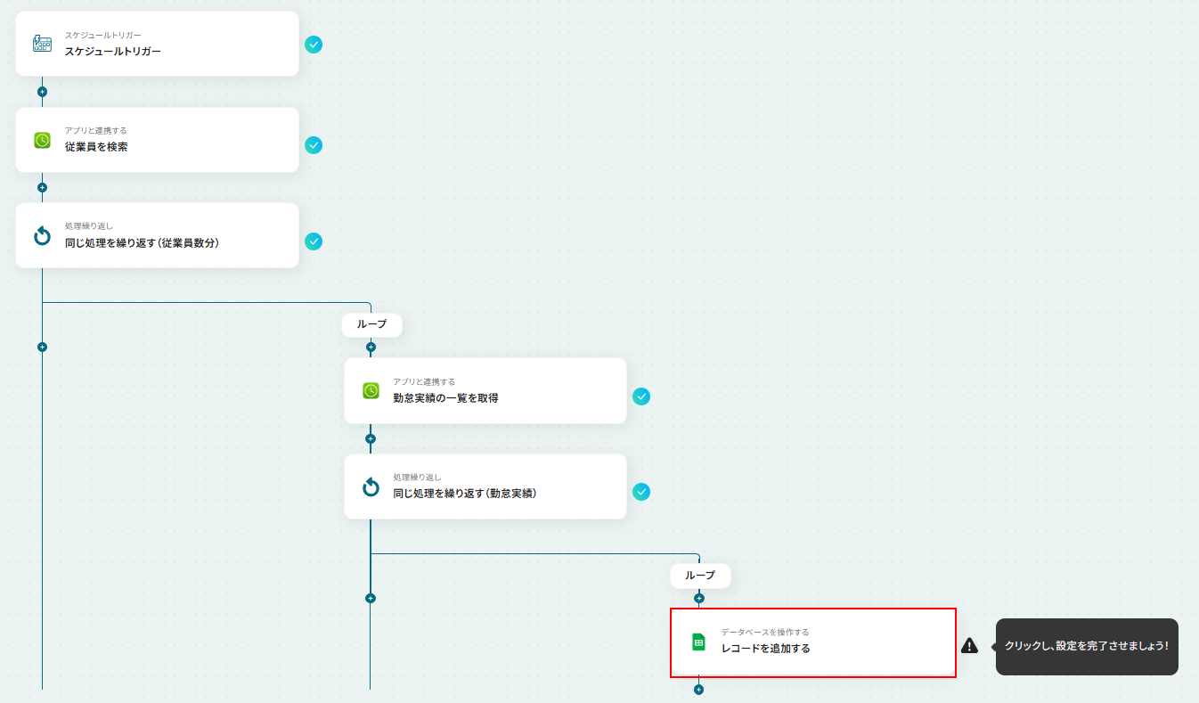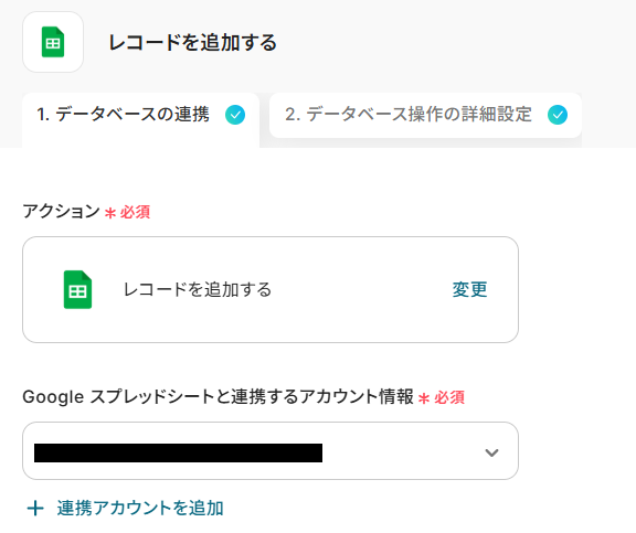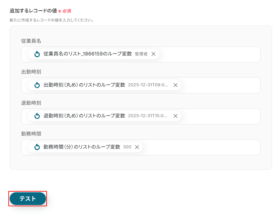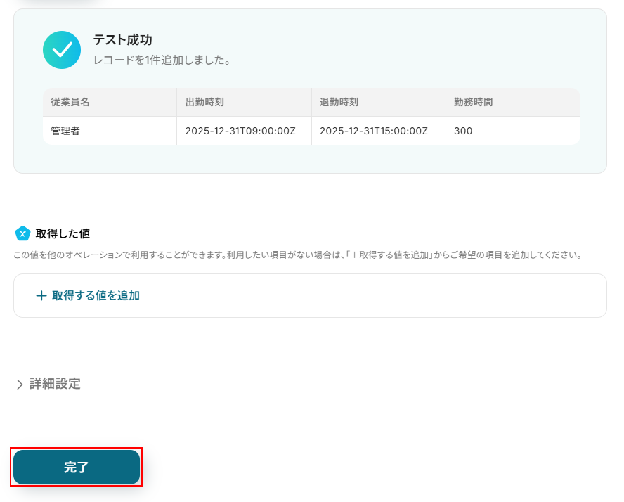 - 最後に、Google スプレッドシートの「レコードを追加する」アクションで、取得した勤怠実績のデータを指定のシートに記録します。