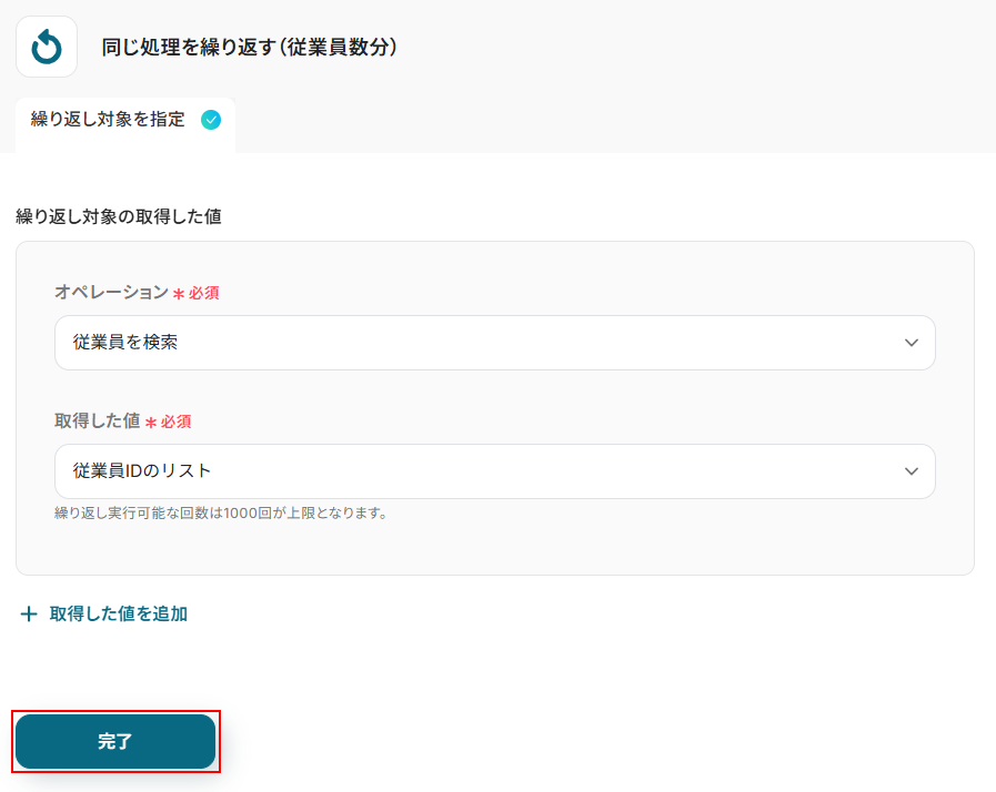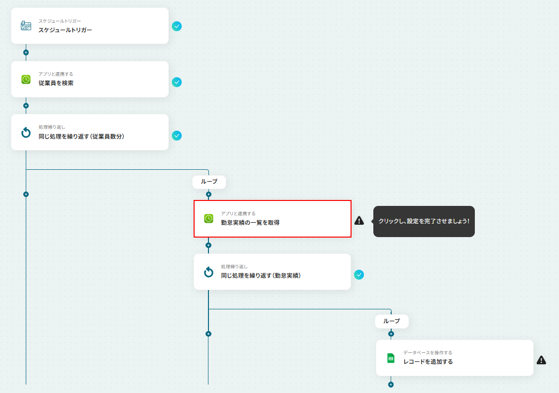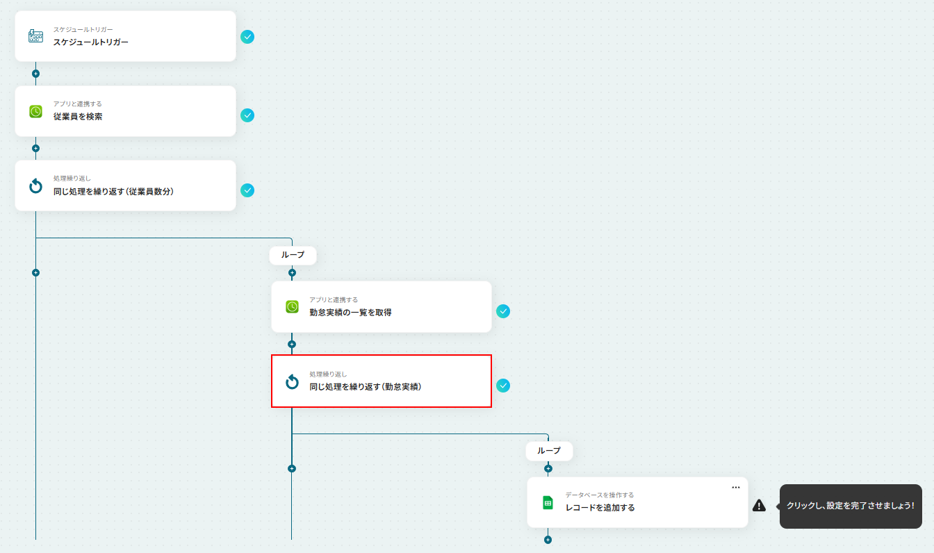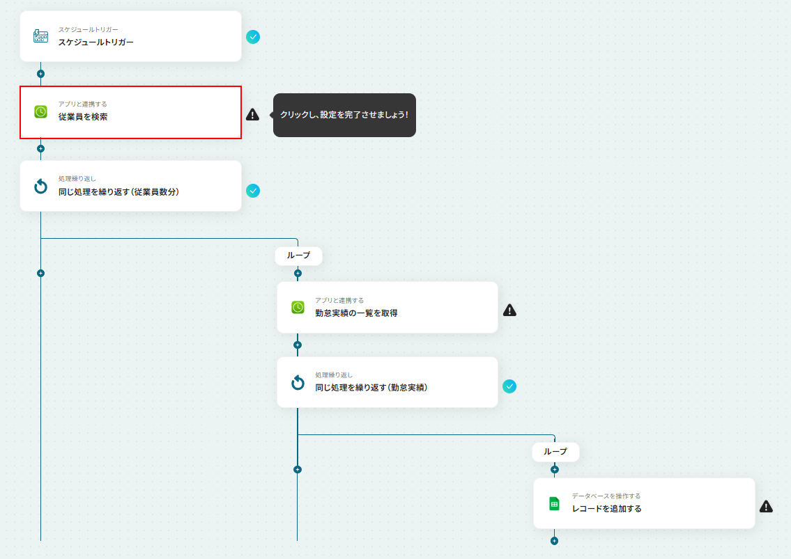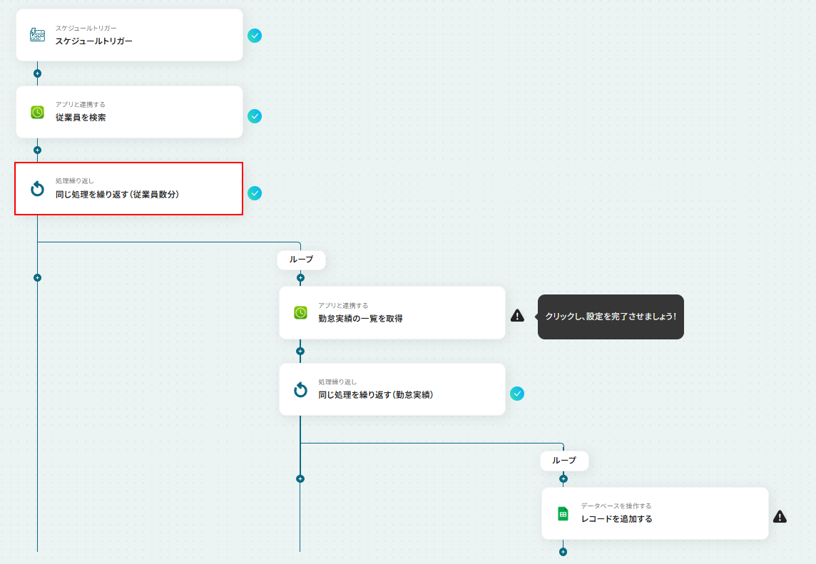 - 次に、繰り返し処理を設定し、取得した従業員情報をもとに、従業員一人ひとりに対して後続の処理を実行するようにします。