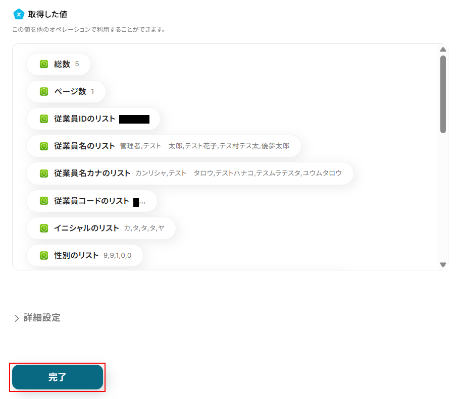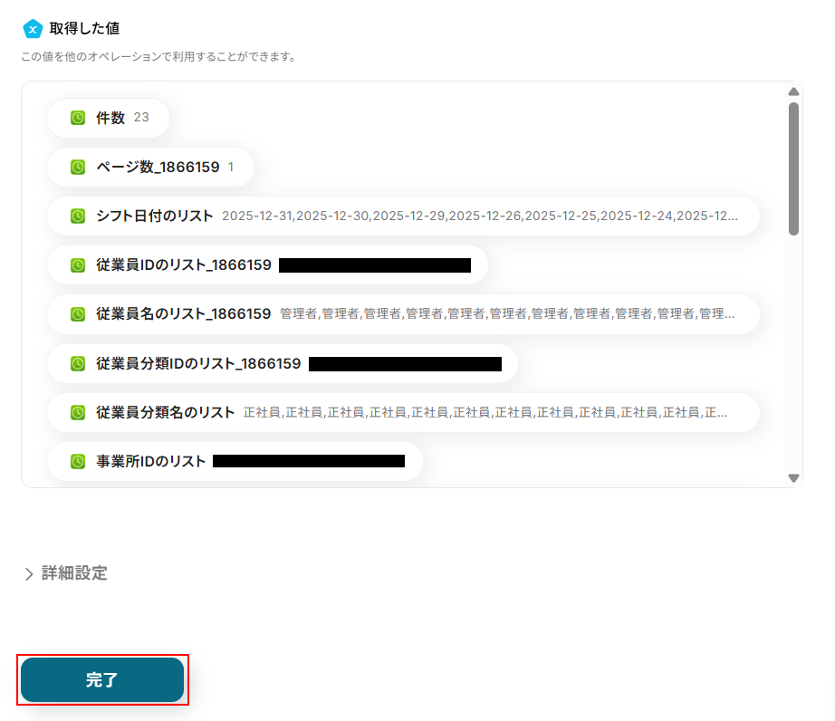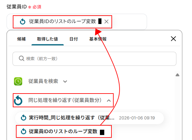今回はデフォルトで従業員を検索アクションで取得した、従業員IDのリストが設定されています。