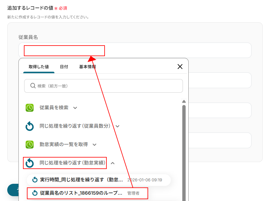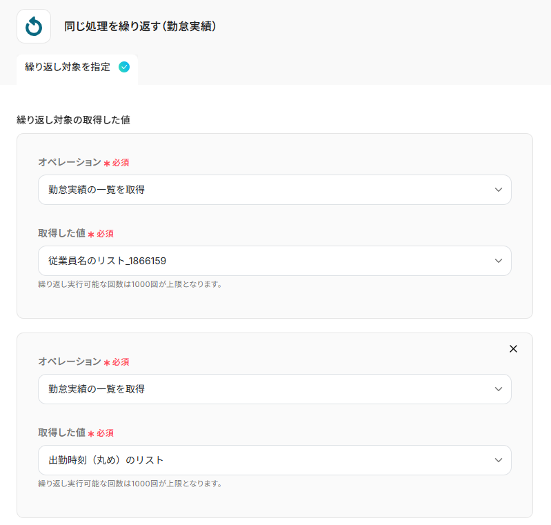 - 繰り返し処理の中で、スマレジ・タイムカードの「勤怠実績の一覧を取得」アクションを設定します。