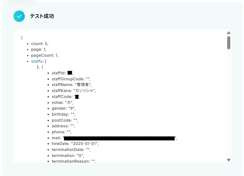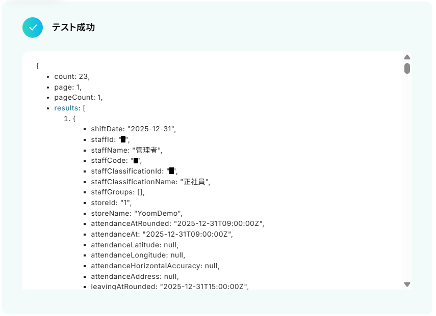 テストに成功するとテスト成功画面が表示され、取得した値が表示されます。