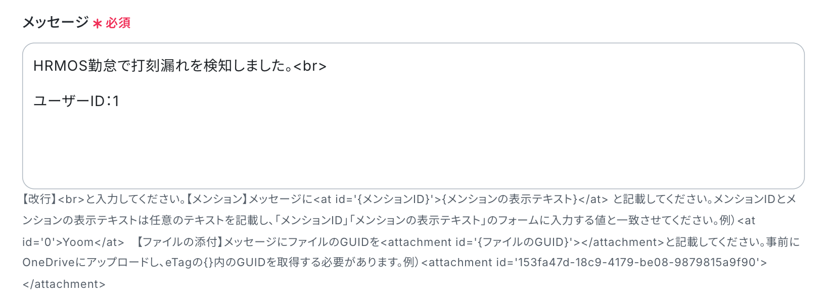 メッセージは、Microsoft Teamsに通知する文章を入力します。 以下の画像のように、任意の文章を設定しましょう。 入力する際は、入力欄下の注釈を参照してください。